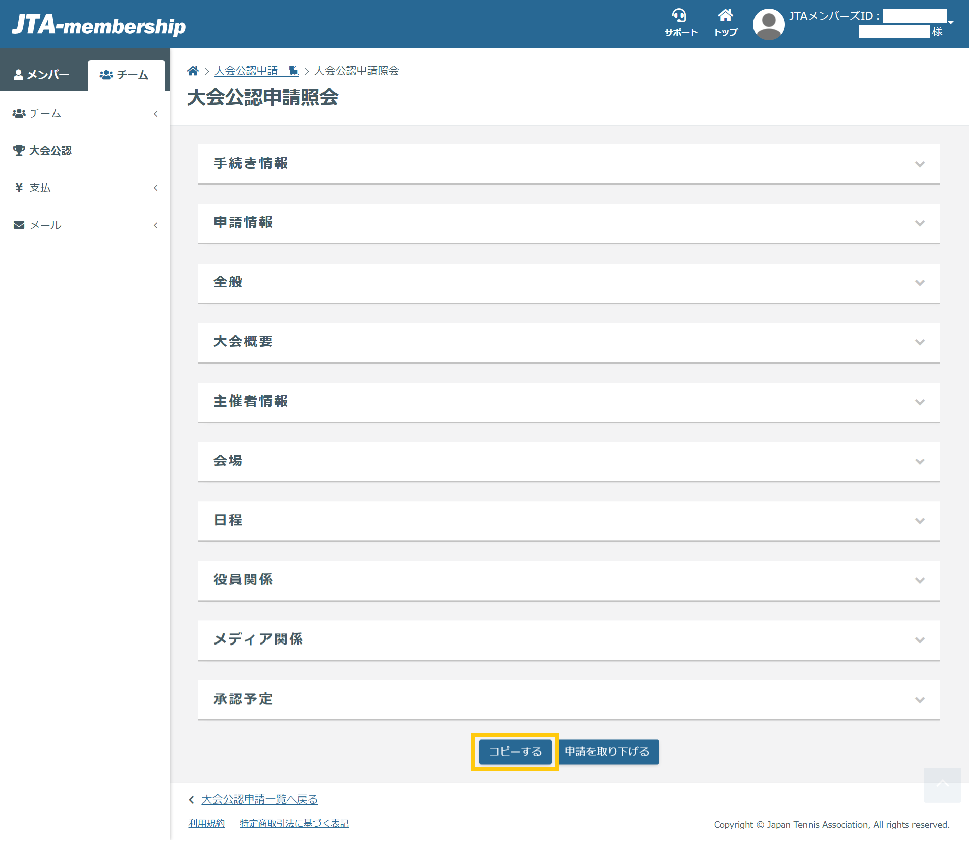 4.大会公認申請照会の画面下部にある【コピーする】をクリック。